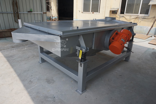 直線振動篩,是一種多用途的,適用于快速大量細(xì)顆粒狀物料分級的篩分設(shè)備,有雙振動電機驅(qū)動,電機安裝在下柜體兩側(cè),當(dāng)兩臺振動電機做同步、反向旋轉(zhuǎn)時,其偏心塊所產(chǎn)生的激振力在平行于電機軸線的方向相互抵消,在垂直于電機軸的方向疊為一合力,因此篩機的運動軌跡為一直線。兩電機軸相對篩面在垂直方向有一傾角,在激振力和物料自重力的合力作用下,物料在篩面上被拋起跳躍或向前作直線運動,從而達(dá)到對物料進行篩選和分級的目的。下出料口大的特點是:物料在篩機中停留時間短,出料迅速。