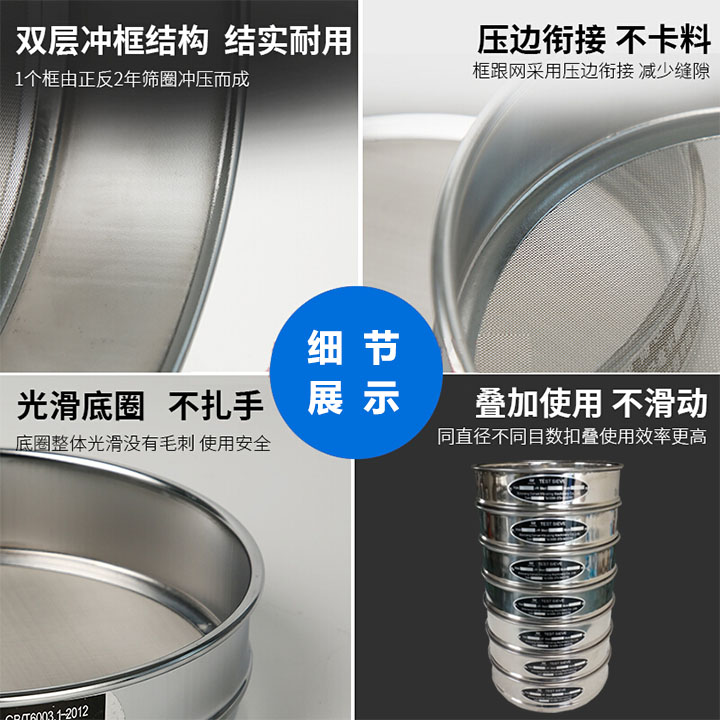 2、篩框采用SUS304(0Cr18ni9)不銹鋼拉伸拋光而成,壁厚0.6-0.7毫米,表面光可鑒人,整體成型堅(jiān)固耐用,沒有磁性,篩網(wǎng)與篩框通過錫焊固定,不會松弛。能耐300度以下高溫。