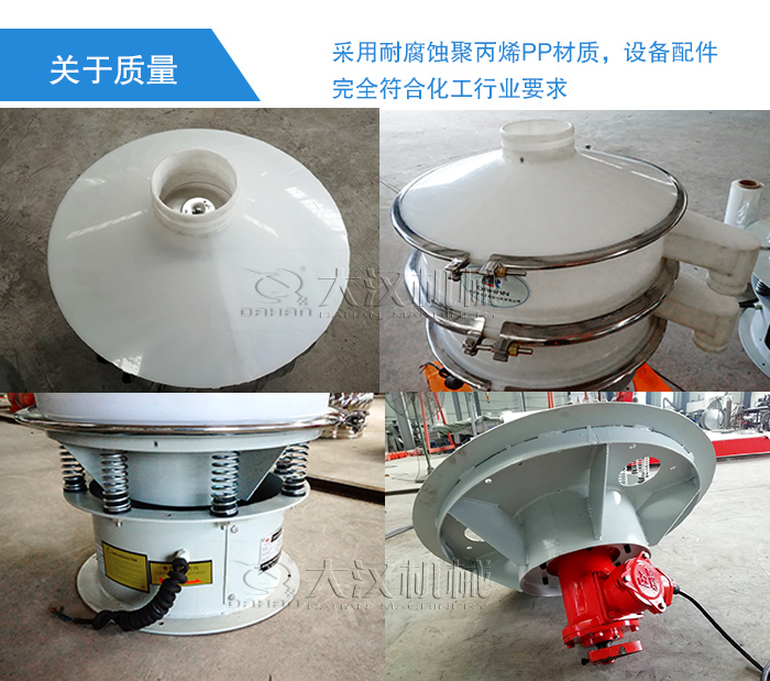好的質量能夠讓您的設備使用更長久,減少后期維修費用,而且設備在篩分效果上也是有別于劣質設備的,大漢化工振動篩采用耐腐蝕聚丙烯PP材質,完全符合化工行業(yè)的要求,設備在做工上也是相當精細的,所有設備配件的選擇均按照化工行業(yè)的安全標準,設備使用更安全。