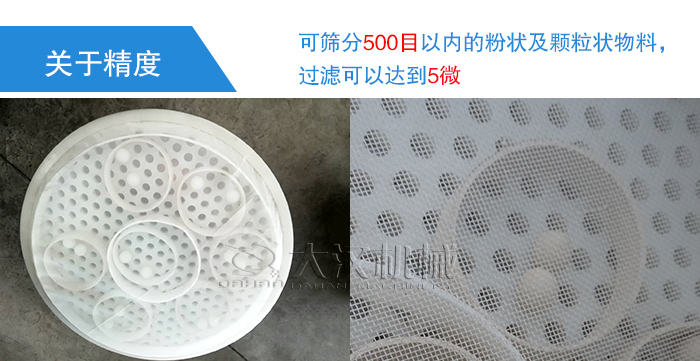 可以篩分500目以內的粉狀及顆粒狀物料,過濾可以達到5微米,而且我們的化工振動篩還可在篩面加裝彈跳球,可江都物料堵孔問題,提高篩分精度。